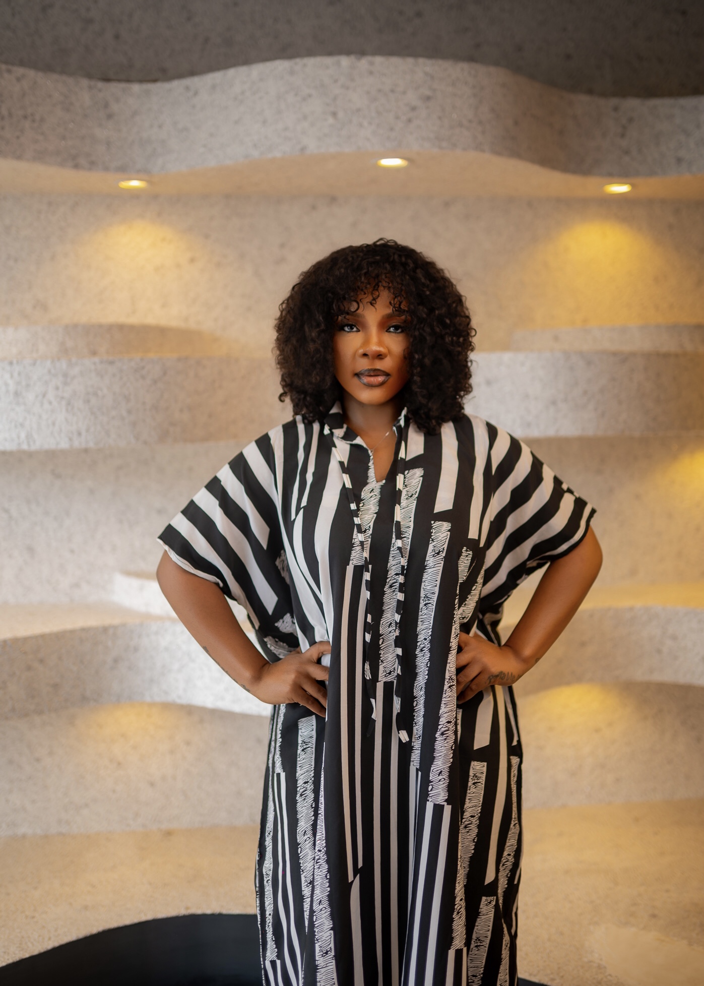 The Monochrome Muse is a striking black and white striped caftan-style dress with a flowy silhouette. The dress features a bold, graphic pattern of vertical stripes in black and white, creating a chic and modern look. The woman in the image wears it with confidence, showcasing the dress's elegance. Details: - Pattern: Bold black and white vertical stripes. - Style: Caftan-style with a flowy fit. - Length: Floor-length, adding to the dress's dramatic effect.