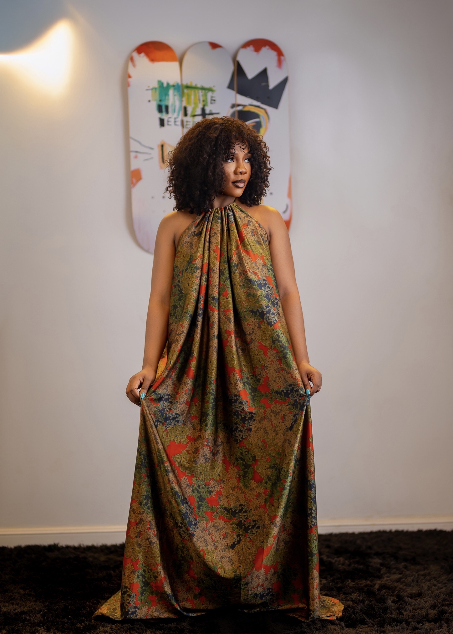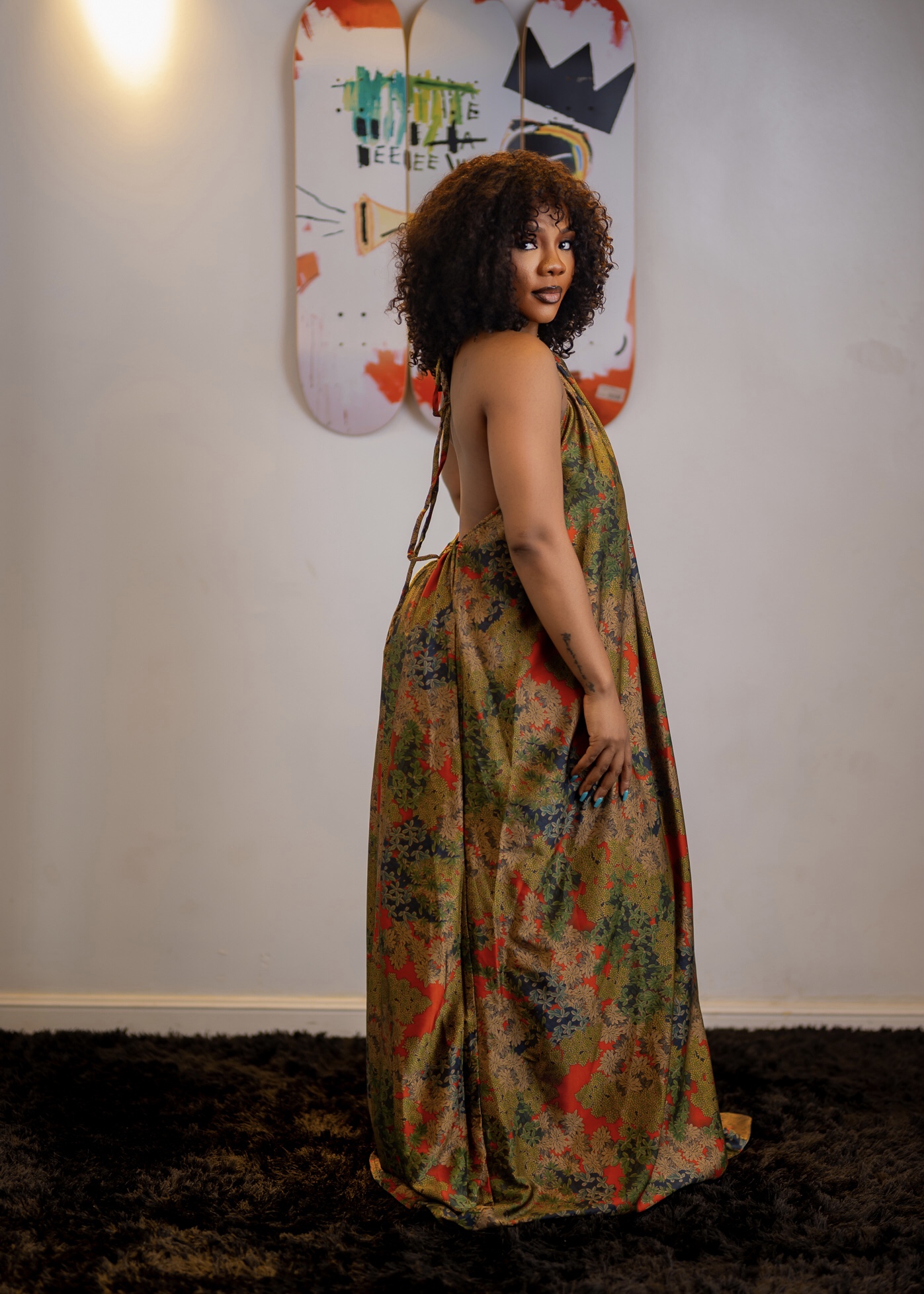 Radiant and bold, the Amber Aura captures the warmth of a golden sunset woven into silk. With amber-orange floral tones, this flowing maxi dress radiates effortless elegance. The open back and elastic neckline bring comfort with allure, while the luxurious drape makes it unforgettable from every angle.
