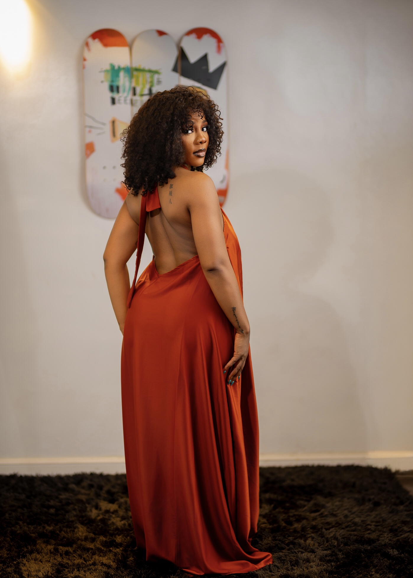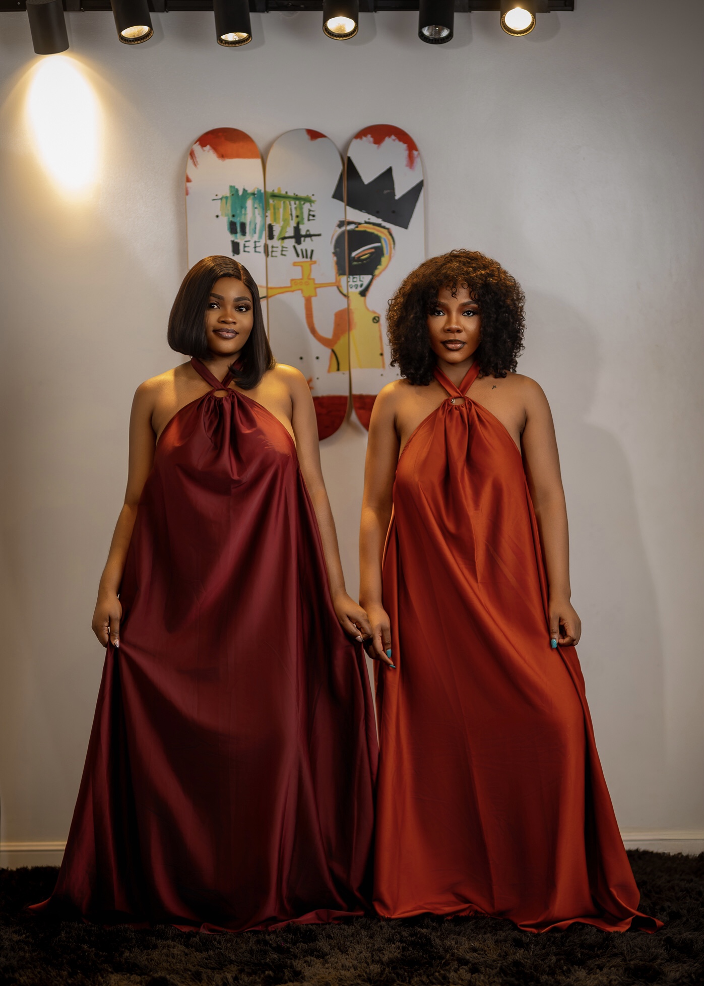 The Solstice Dress Where radiant light meets timeless elegance. Crafted from premium silk, The Solstice Dress is a flowing expression of freedom and femininity. Its open-back silhouette drapes effortlessly, while a bold iron ring detail at the neckline allows delicate ropes to tie elegantly at the back merging modern allure with timeless grace. Designed for women who move with confidence, this dress captures the transition of moments: fiery sunsets and deep, lingering nights. ⸻ 🌅 Sunflare (Burnt Orange) Vibrant and warm, Sunflare reflects the brilliance of a setting sun. Its glowing hue radiates energy and bold elegance, perfect for leaving a luminous impression. • Fabric: 100% Premium Silk • Design: Flowing open-back, iron ring neckline, rope tie detail • Mood: Radiant · Bold · Captivating Care Instructions • Dry clean only for longevity • Steam gently on low heat to remove creases • Store hanging in a breathable garment bag • Avoid contact with sharp jewelry to protect the silk finish ⸻ 🍷 Velour (Crimson) Rich and sultry, Velour embodies depth and timeless sophistication. Its deep wine tone creates an aura of quiet power and sensual elegance, perfect for evening allure. • Fabric: 100% Premium Silk • Design: Flowing open-back, iron ring neckline, rope tie detail • Mood: Luxurious · Elegant · Refined Care Instructions • Dry clean only to preserve fabric and color richness • Steam lightly before wear; avoid direct heat • Store flat or hanging away from sunlight • Handle delicately to protect the silk weave ⸻ The Solstice Dress is not just a garment it is an experience of light, flow, and elegance that lingers long after you’ve left the room.