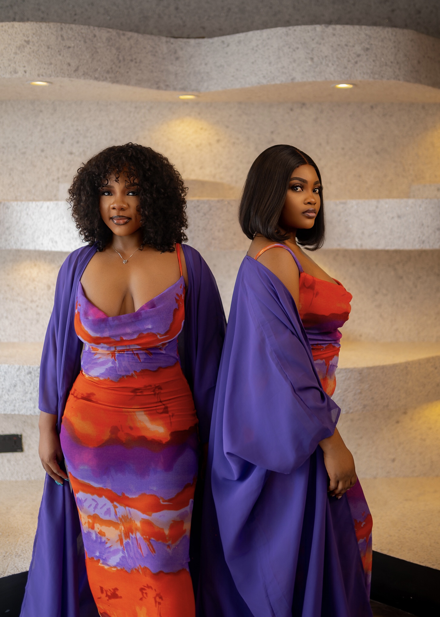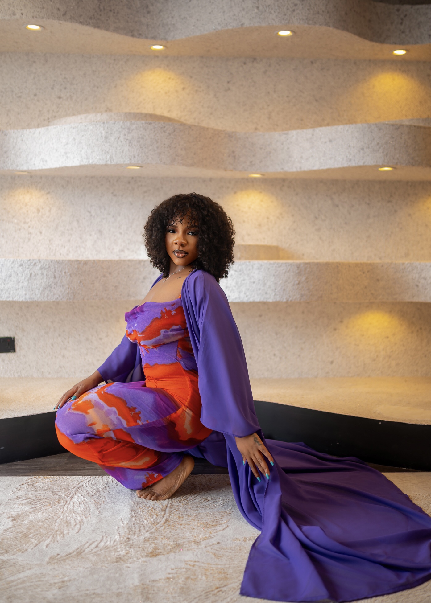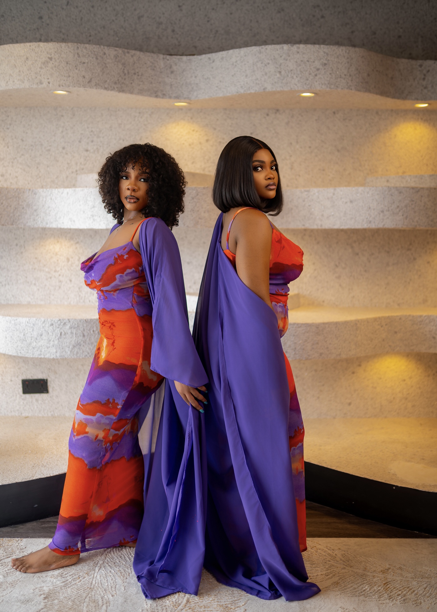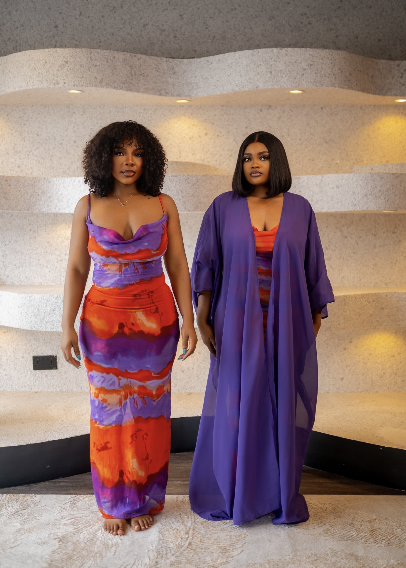 For the woman who embodies warmth, radiance, and effortless allure, IMPERIAL ORCHID celebrates the poetry of summer sunrises. Its sunset-inspired hues of orange, red, and violet sculpt the body in a curve-hugging silhouette, while the flowing purple chiffon overlay adds movement and sophistication.
